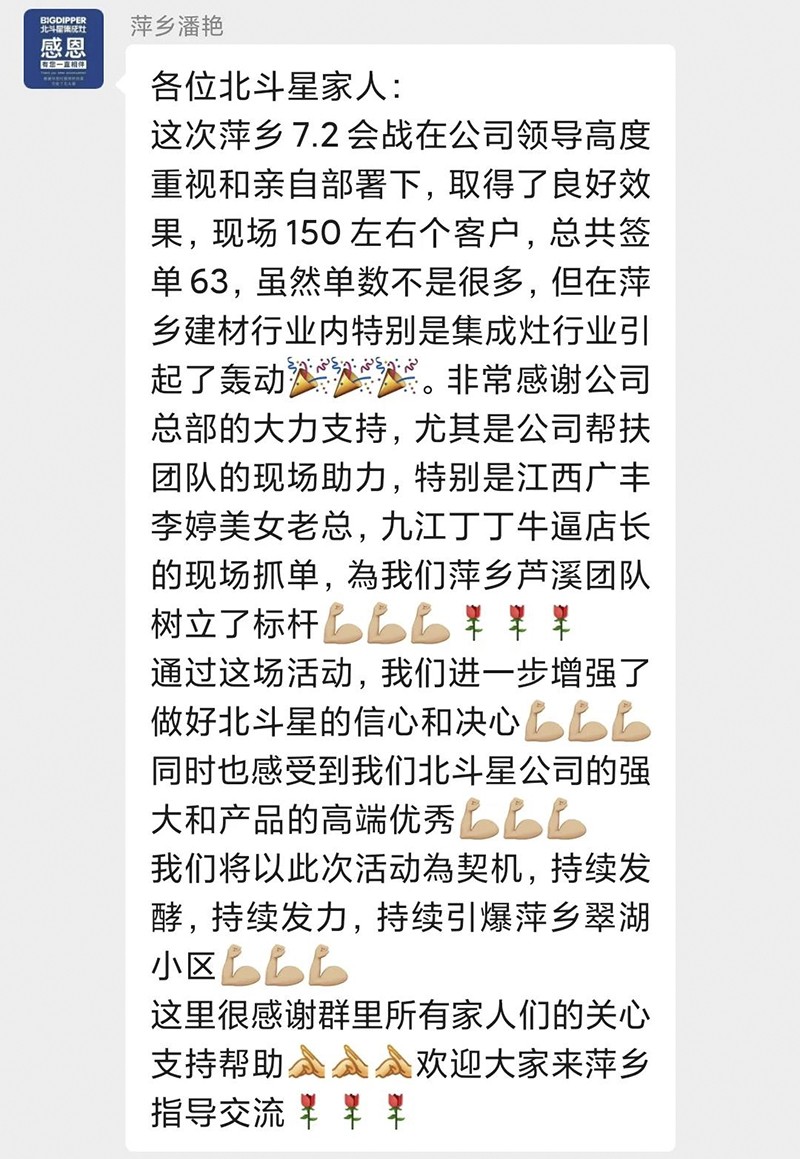 團(tuán)購(gòu)會(huì)始伊,經(jīng)過(guò)統(tǒng)一的活動(dòng)部署和戰(zhàn)略規(guī)劃,本次活動(dòng)得到了北斗星集成灶總部的大力支持,北斗星萍鄉(xiāng)店的家人們以飽滿的熱情和專業(yè)的服務(wù),迎接每一位慕名而來(lái)的業(yè)主朋友們。