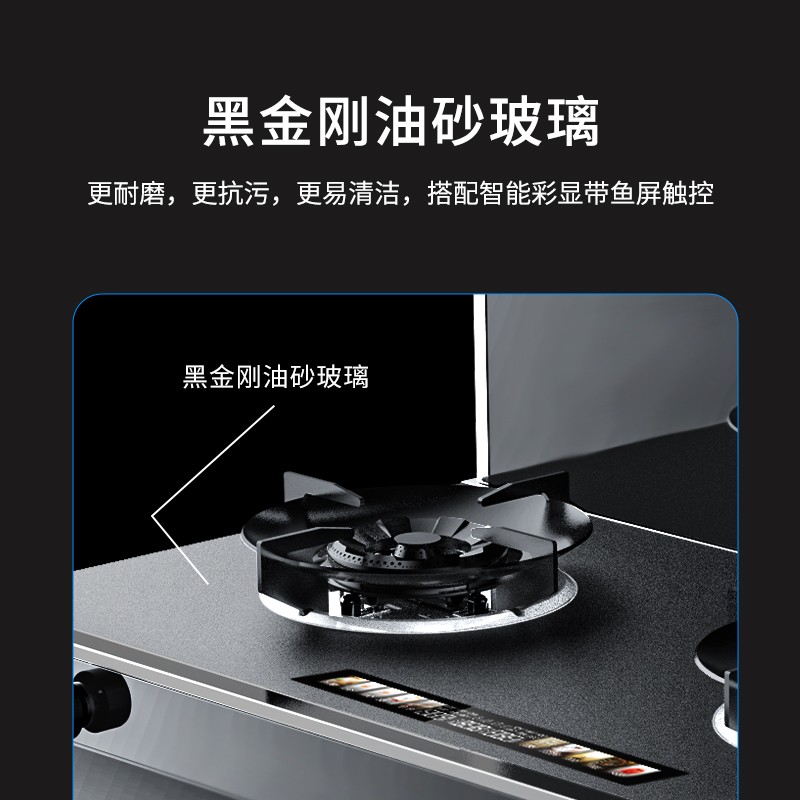 除卻外觀(guān)上的美學(xué),臺(tái)面采用黑金剛油砂玻璃材質(zhì),無(wú)懼廚房油污,一擦即凈。搭配智能彩顯帶魚(yú)屏觸控,整體臺(tái)面質(zhì)感十足。